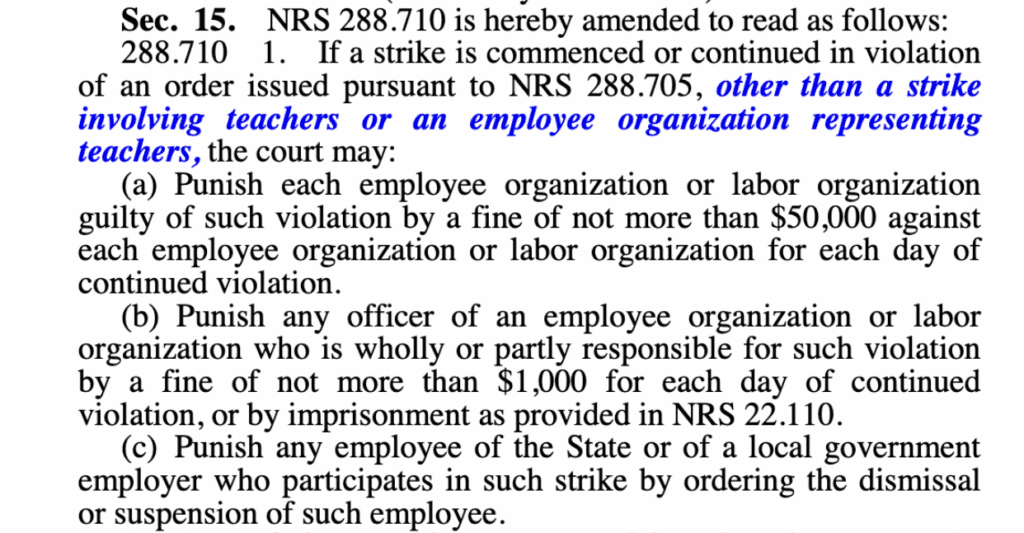 According to the new legislative language, a concerted action can only be ruled a strike if it has occurred “on a district-wide basis.” For a district like Clark County, with over 370 schools, this means that educators from hundreds of schools can go on a strike without repercussions, as long as teachers from one school don’t participate.